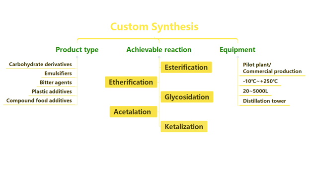 Компания прилагает большие усилия к сладкой химии много лет, способна к тонким сладким химикатам, к заказу и изготовлению врачебных полупродуктов, к индустриальному производству, также имеет патент на изобретение в области сладкой химии. Особенно, она способна к реакции этерификации, реакции дибензоиловых эфиров, реакции гликозилирования, реакции метил изобутил кетон и т. д.