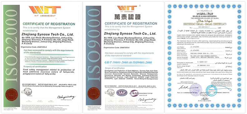 Компания искреннее сотрудничает с партнерами в разных сферах по принципу взаимного благоприятствования, взаимной выгоды и совместного развития, с целью «наука, качество и сервис». В марте 2002 г. компания получила сертификат системы менеджмента качества ISO9001; в июле 2008г. компания предварительно зарегистрирована в «Европейское законодательство REACH»; в марте 2014г. компания получила сертификат системы менеджмента безопасности пищевой продукции ISO22000; в марте 2017г. Компания получила сертификат MUI HALAL и т. д.; создание системы менеджмента является длительным ходом для настояния и улучшения, и в этом ходе, компания испытает переходящее развитие раз за разом.