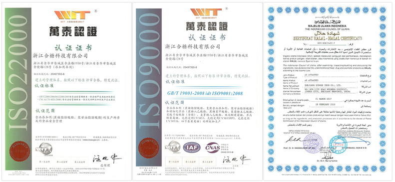 合糖科技本著“源于科技,興于品質(zhì),成于服務(wù),安全發(fā)展”的經(jīng)營(yíng)宗旨,與各界同仁真誠(chéng)合作,互惠互利,共同發(fā)展。2002年3月公司通過(guò)ISO9001質(zhì)量管理體系認(rèn)證;2008年7月公司通過(guò)“歐洲REACH法規(guī)”預(yù)注冊(cè);2014年3月公司通過(guò)ISO22000食品安全管理體系認(rèn)證;2017年3月公司通過(guò)MUI HALAL認(rèn)證等等;管理體系的建立是一個(gè)長(zhǎng)期堅(jiān)持和不斷完善的過(guò)程,在這個(gè)過(guò)程中,浙江合糖科技有限公司經(jīng)歷了一次次跨越式的發(fā)展。